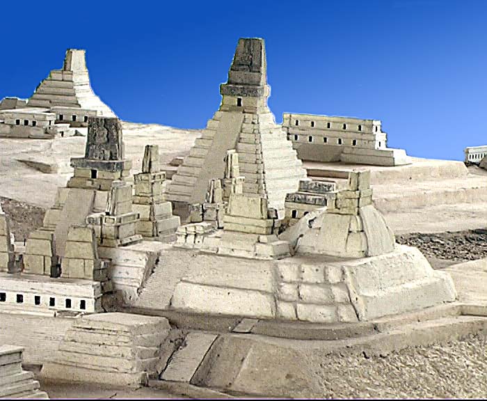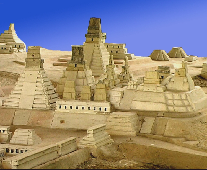 Modellauschnitt der Grossen Plaza von Tikal mit Tempel I (dem Jaguartempel) und II und Teilen der Nordakropolis.(Nationalmuseum Guatemala) |